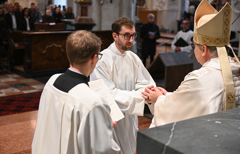 Nach dem Versprechen zur Diakonweihe und dem Treueversprechen und nach Anrufung des Heiligen Geistes und der Heiligen legte Bischof Wilhelm dem Weihekandidaten in Stille die Hände auf und sprach das Weihegebet. Im Anschluss daran wurde er von Regens Thorsten Schreiber und seinem Heimatpfarrer Friedrich Trstenjak mit der Dalmatik und der Stola bekleidet. Der Bischof überreichte ihm das Evangeliar mit dem aus der Weiheliturgie lautenden Zuspruch „Das Evangelium Christi durchdringe dein Leben!“ Der anschließende Friedensgruß durch den Bischof und Diakon Jean-Baptiste Iranzi als Zeichen der Aufnahme in die Gemeinschaft der Diakone schloss die Weiheriten ab.