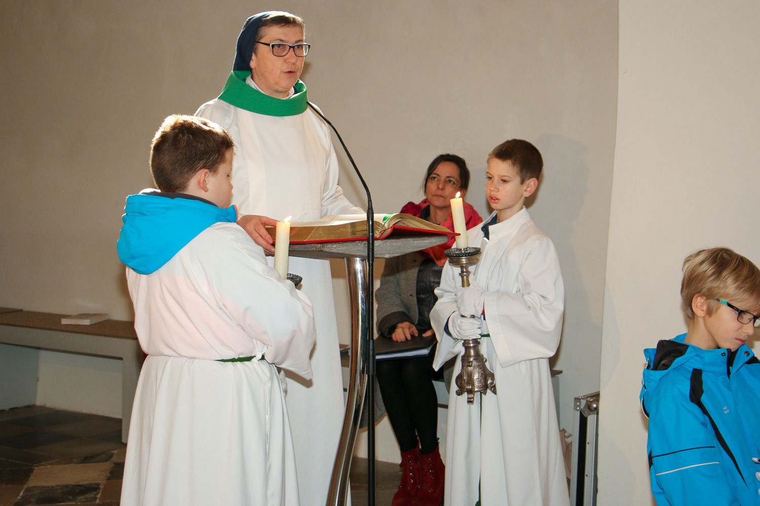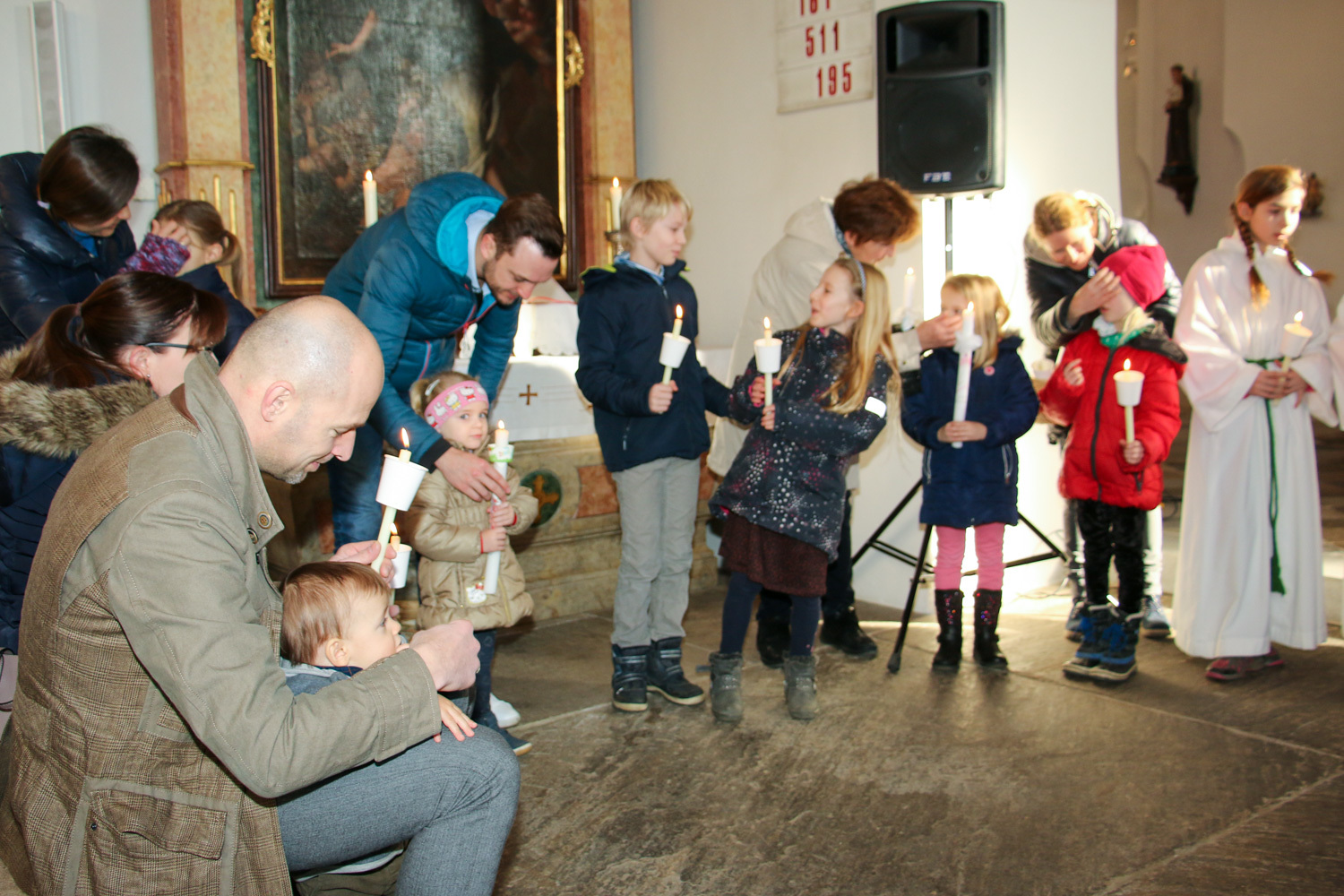 Drei Mütter sprachen bei der Predigt über die Themen aus dem Evangelium (Salz und Licht) und der Taufe. Bei der Taufe stehen drei Symbole im Mittelpunkt: Das Taufwasser, das weiße Kleid und die Taufkerze. Diese Taufkerze brachten die Kinder mit, um sie an der Osterkerze zu entzünden und so an ihre Taufe erinnert zu werden.