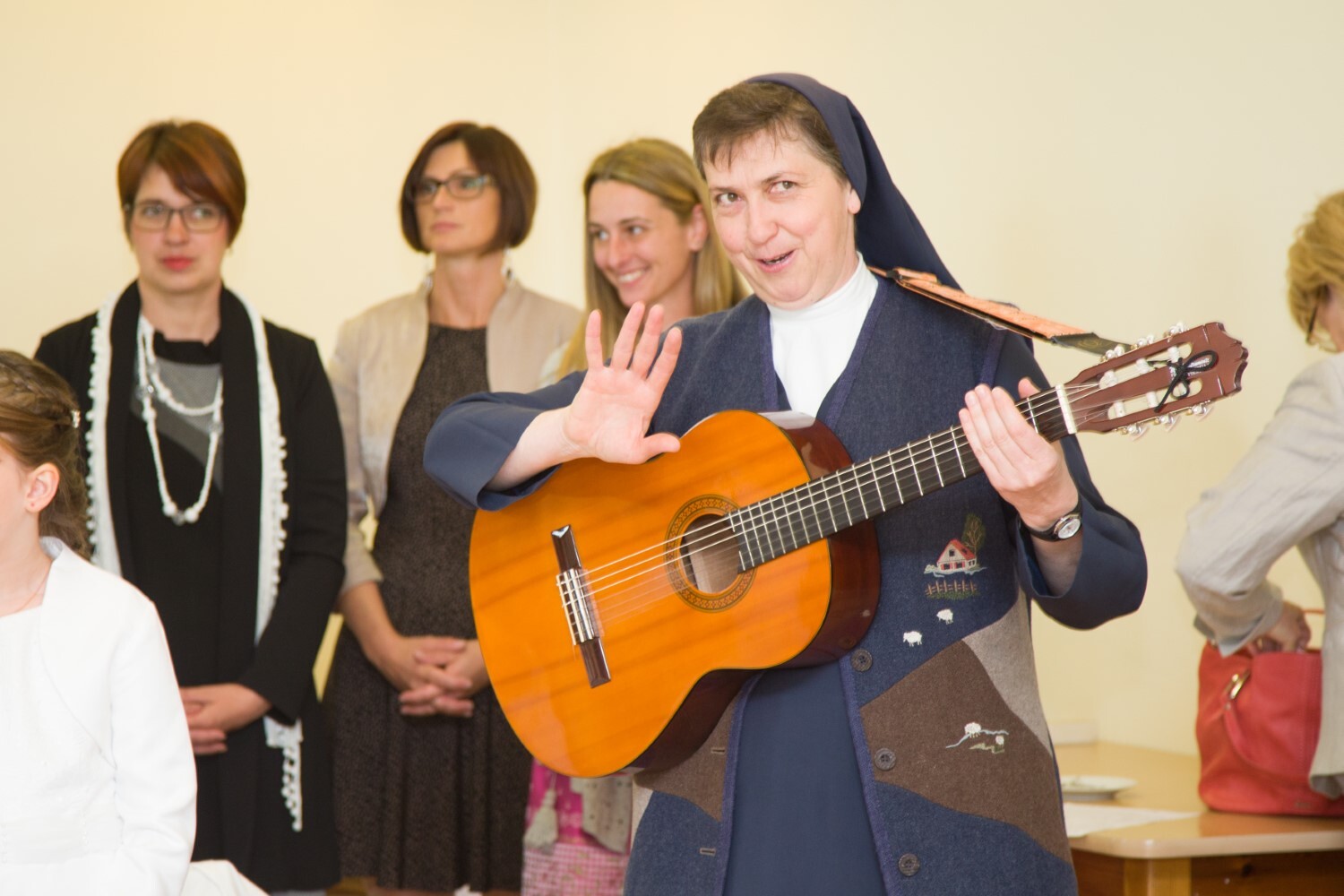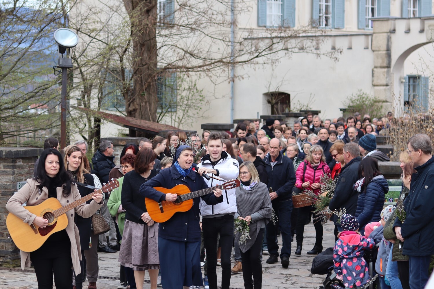 Sr. Maria spielt und singt „Jesus geht in die Stadt hinein“ bei der Palmprozession
