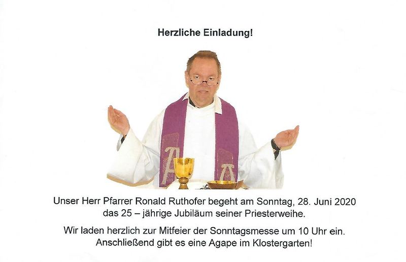 Pfarrer Ruthofer 25-jähriges Priesterjubiläum. Wir laden herzlich zur Mitfeier der Sonntagsmesse am 28. Juni um 10 Uhr ein