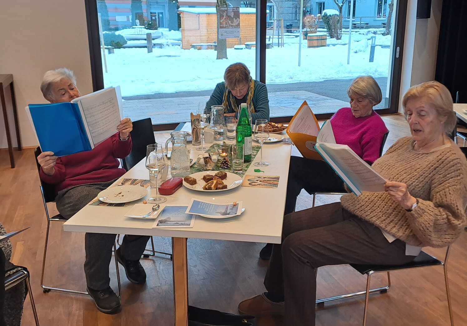 Bei einem Gläschen Wein, Kaffee und hausgemachten Mehl­spei­sen wur­den dann auch einige alt­bekan­nte Lie­der ge­sun­gen. Regina Dietrich be­glei­te­te die Sänger:­innen auf der Gitarre und die mit­ge­brach­ten Texte ver­lei­te­ten die Gäste zum Mit­singen.