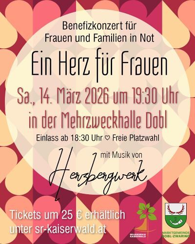 Erleben Sie Herzbergwerk live! Das Benefizkonzert rund um den Weltfrauentag am Samstag, 14. März 2026, in Dobl. Jetzt Tickets sichern und damit Frauen und Familien in Not helfen!