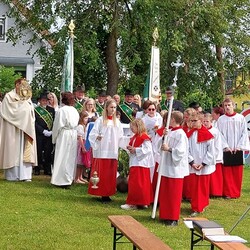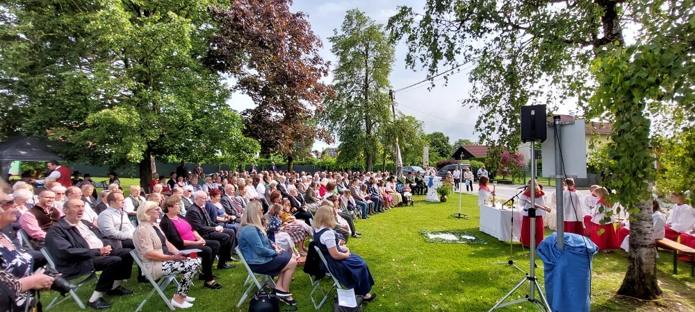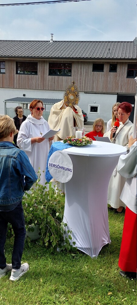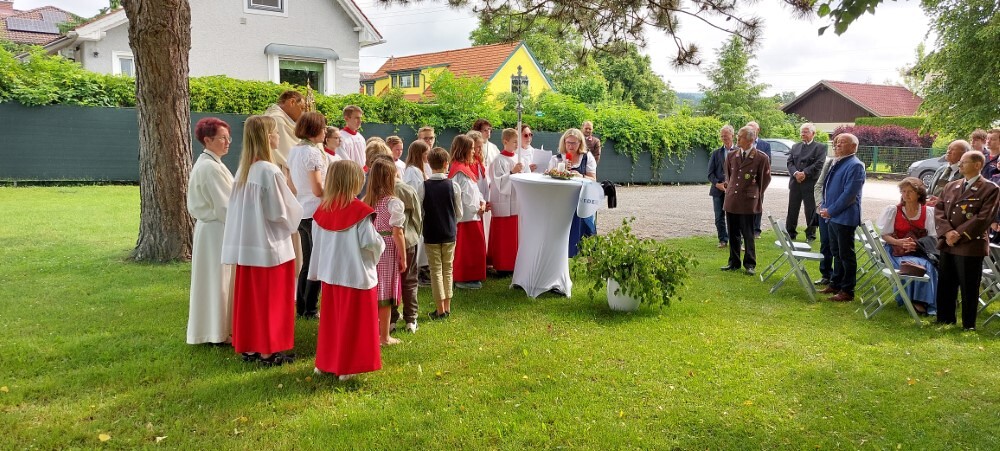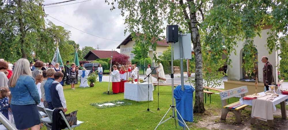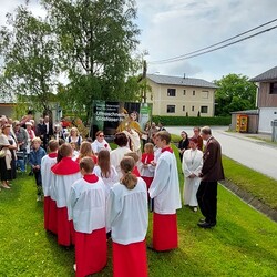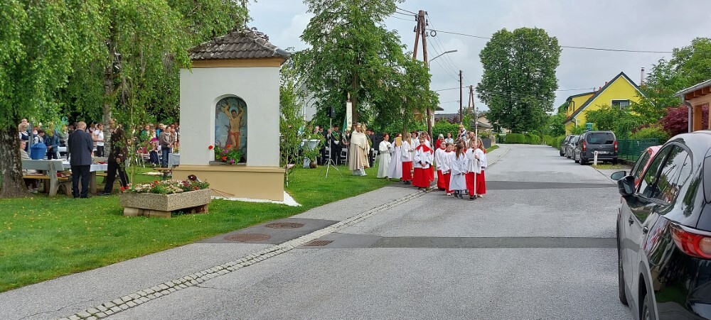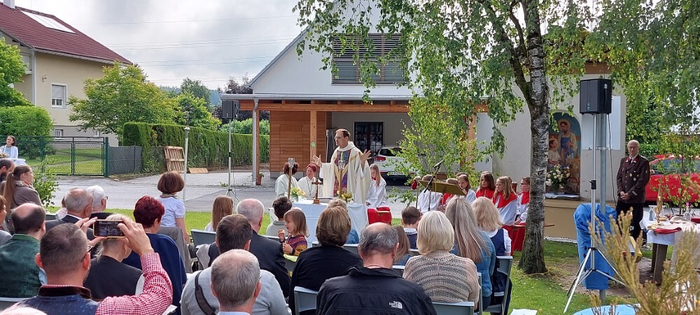 Im Anschluss an die Hl. Messe, zelebriert von Vikar Gerhard Hatzmann und begleitet von Kantorin, Lektoren und liturgischen Diensten beider Pfarren, fand eine Andacht bei den vier Stationen am Dorfplatz statt. Für die kleine Prozession waren vier Brottische als Altäre gerichtet, als Sinnbild für die vier Himmelsrichtungen und dafür, dass Christus der Heiland der ganzen Welt ist. Im gemeinsamen Liedruf "Brot des Lebens" zogen die liturgischen Dienste und die Kinder stellvertretend für das Volk Gottes zu den vier Altären: Brot der Liebe – Brot der Versöhnung – Brot des Friedens – Brot der Hoffnung. Zum Abschluss erteilte Vikar Hatzmann den Eucharistischen Segen, verbunden mit der Einladung, das Allerheiligste gemeinsam zur Kirche zu begleiten. Die Feier schloss mit dem gemeinsam gesungenen "Te Deum" ab. Zu den Feierlichkeiten waren auch die Vereine wie Feuerwehr und ÖKB eingeladen.
