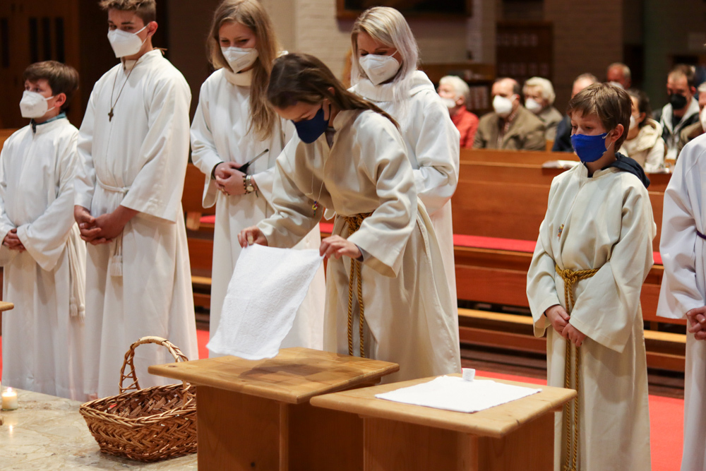 In einer etwas anders gestalteten Fußwaschung wurde jenen gedacht, die nicht oder nicht mehr am Leben der Kirche teilnehmen können oder möchten. Die Stühle blieben leer. Symbolisch für Rand- und Zielgruppen und jene Menschen, die unsere Gesellschaft mitprägen, wurden Kerzen entzündet. Als Zelebranten fungierten unsere drei Priester, drei Diakone sowie alle Pastoralreferentinnen und Referenten, welche den Sendungsauftrag im Seelsorgeraum Kaiserwald erfüllen.