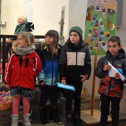 "Mit Jesus gemeinsam auf dem Weg" sind 15 Kinder der Volksschule Tobelbad, die sich mit ihrer Religionslehrerin Katrin Oswald auf die Erstkommunion vorbereiten. Mit dem Kyrie und dem fürbittenden Gebet bitten sie Eltern, Freunde und die Pfarrgemeinde sie auf diesem Weg zu begleiten. Vikar Norbert Glaser erinnert daran, dass sie schon seit der Taufe Kinder Gottes sind.