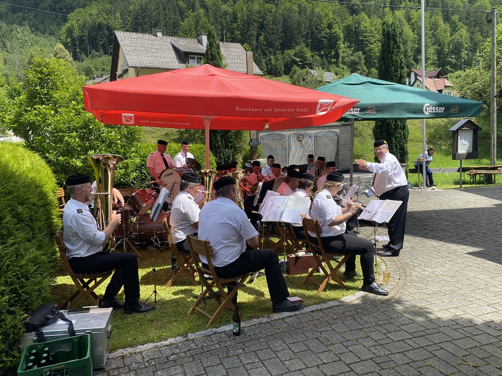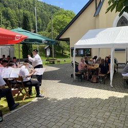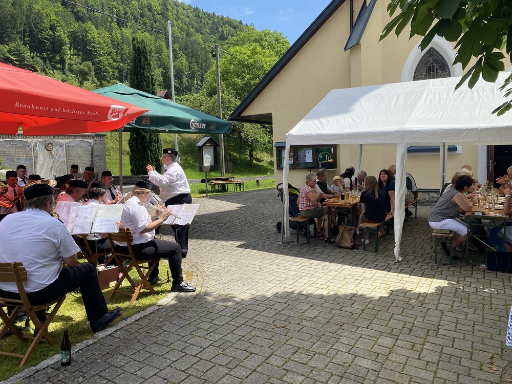 Pater Thomas feierte mit uns das Hochamt um 10:30 Uhr. Geige, Orgel und Trompeten brachten uns in feierliche Stimmung. Nach dem Gottesdienst spielte die Bergknappenkapelle Unterlaussa. Es gab alles von Schnitzel bis Schilcher Charmant.