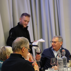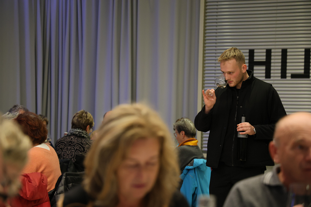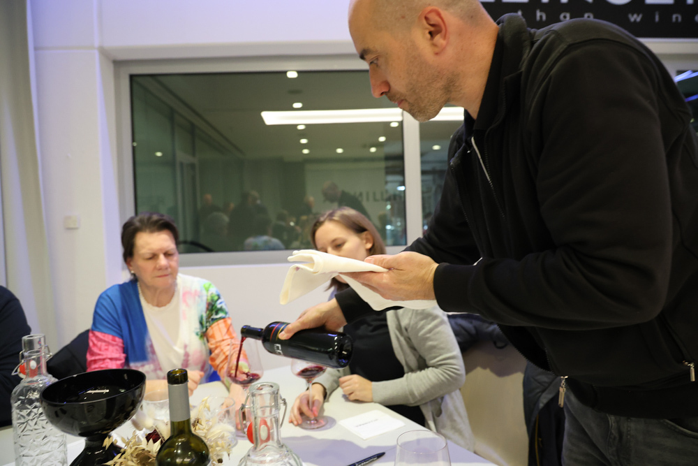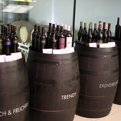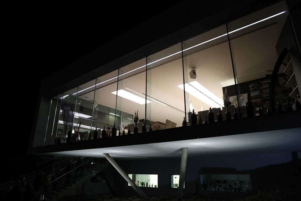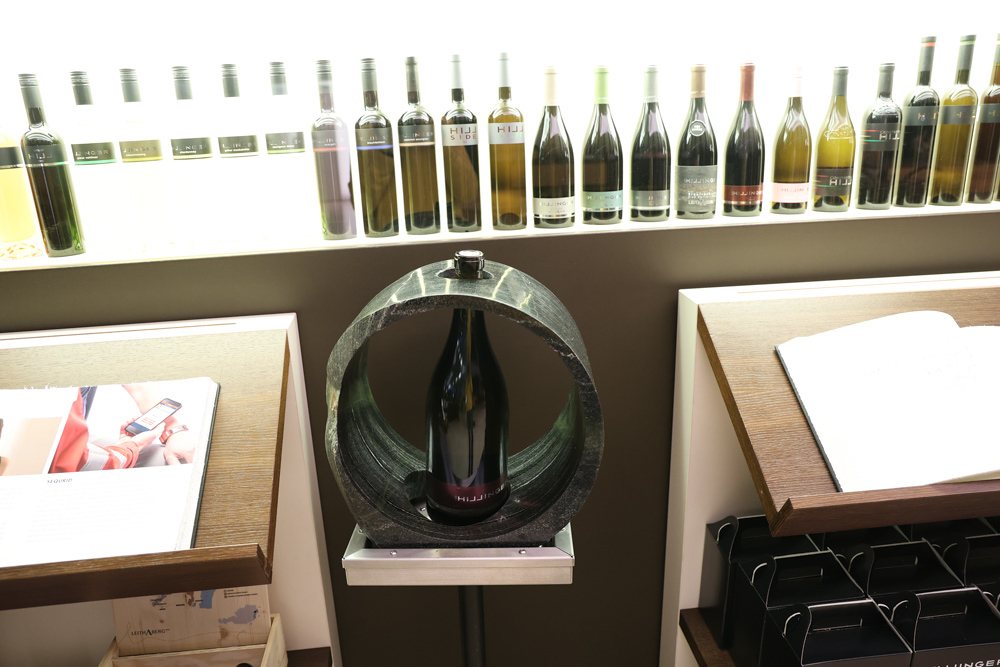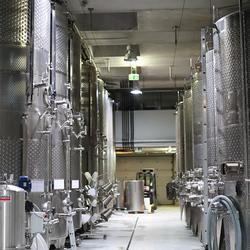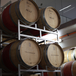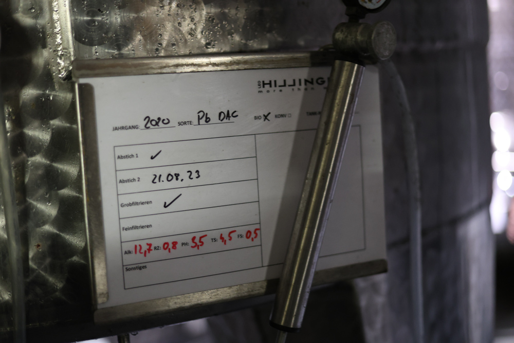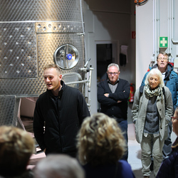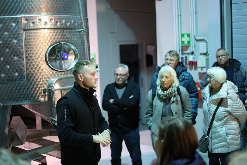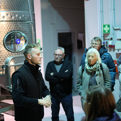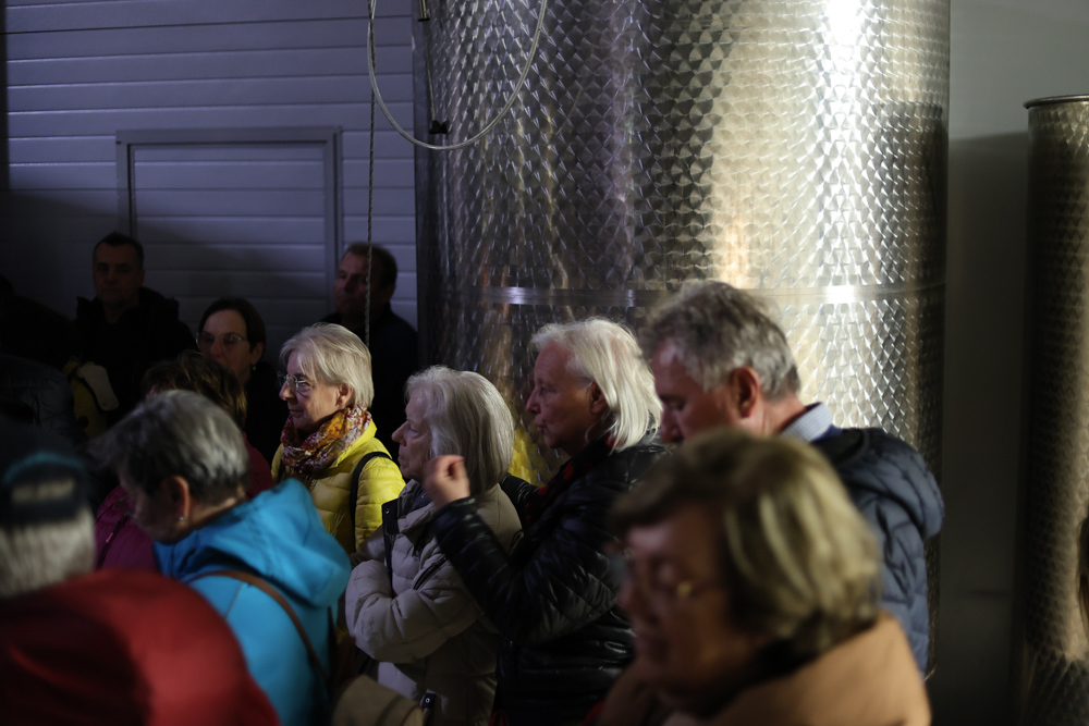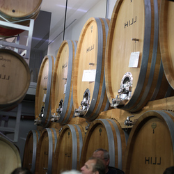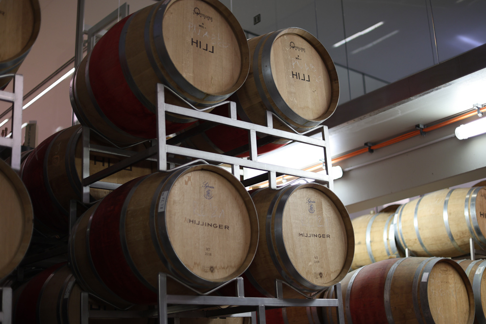 Zum krönenden Abschluss fuhren wir weiter nach Jois im Burgenland zum Weingut Leo Hillinger. Zuerst wurden wir durch den Weinkeller geführt. Zwischen Stahltanks und Barriquefässern konnten wir alle möglichen Fragen zum Wein und Weingut stellen. Im Gebäude darüber konnten wir mit Blick auf den Weinkeller vier Weine verkosten. Zur Stärkung durfte eine Jause dazu nicht fehlen.